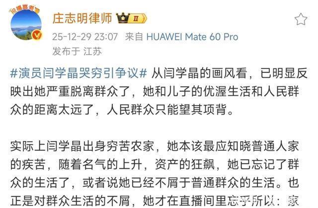 2025年12月29日,曾多次登上春晚、以“亲民”形象著称的演员闫学晶,在直播聊家事时的一番话引发全网热议。她称儿子儿媳一年挣三四十万,在北京却不够花,年开销得上百万,还劝儿子多拍短剧赚钱,不然日子过不下去。面对网友质疑,她更是回怼“酸黄瓜”,暗指网友因嫉妒才指责她。